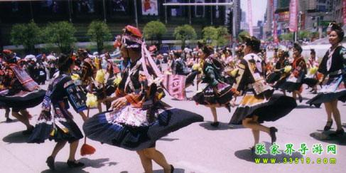 亞宜帶領(lǐng)眾人迎敵,戰(zhàn)斗了三天三夜,終因寡不敵眾向西撤退,得到貴州苗族支持,同官家周旋了一年。第二年四月八亞宜和貴州英雄亞努等人戰(zhàn)死在貴陽(yáng)城。從那時(shí)起,“四月八”就成了青年男女聯(lián)歡節(jié)和祭祀英雄的紀(jì)念日。盡管歷代統(tǒng)治階級(jí)都以各種借口加以禁止,而具有反抗精神的苗族人民,只是改變了跳花的形式,仍然保留著聚會(huì)對(duì)歌內(nèi)容。一年一次,世代相傳,知道民國(guó)時(shí)期各地才先后中斷。后于一九八一年國(guó)家民委批示統(tǒng)一在京的苗族過(guò)“四月八”而才得到恢復(fù)。一九八六年在鳳凰上下落朝井鄉(xiāng)龍?zhí)梁哟澹?ldquo;四月八”的發(fā)源地舉行隆重聚會(huì)。這一天啟明星才掛在樹(shù)尖尖上的時(shí)候,湘黔邊境各地的男女青年,身著節(jié)日的盛裝,踏著路邊毛草上的露珠,唱著歌,吹著木葉,嘻嘻哈哈,迎著燦爛的朝露,從各條彎彎的山道上,向“跳花溝”涌來(lái)。十嶺八坡,山溝里外,龍河兩岸都站滿了人,熙熙攘攘,熱鬧非凡。會(huì)場(chǎng)的正中掛有寬六尺長(zhǎng)七尺的淺紅大旗,繡有“四月八”三個(gè)大字,兩邊龍鳳圖案,莊嚴(yán)古樸,表示歷史悠久和不忘祖先功德。