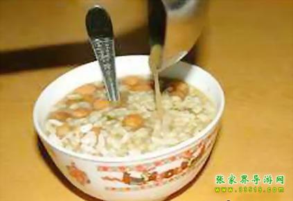 油茶湯對(duì)土家族人來說一日三餐少不了。土家油茶湯是張家界土家族具有代表性的包含文化現(xiàn)象之一,土家語(yǔ)稱“色斯?jié)缮?rdquo;,堪稱中國(guó)茶文化一絕,源遠(yuǎn)流長(zhǎng)。據(jù)清代的古書記載:“土人以油炸黃豆,包谷,米花,綠焦諸物,取水和油,煮茶葉和湯泡之,餉客致敬,名曰:‘油茶’”。