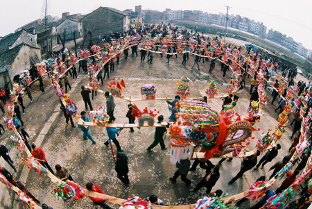 龍舞是中國民間體育藝術。大庸境內的板凳龍是 別具一格的龍舞形式。尤其桑植縣白族人民,對舞板 凳龍有著特殊偏愛。 白族同胞耍板凳龍,相傳起于漢代,由白族先民 “舞龍求雨”的宗教活動演變而來。 板凳龍有兩種樣式。一種是簡式板凳龍,由二個 舉長凳為頭,一人在后選適當“舞臺”表演;另一種 是“篾扎板凳龍”,即用竹篾扎成龍形置于板凳之上 ,以木腳示龍爪,造型美觀,逼真。耍板凳龍又分兩 種舞式,一為獨凳龍,一為九節(jié)龍(九張板凳相接)。 舞板凳龍動作有“二龍搶珠”、“黃龍穿花”、“二 龍戲水”、“金蟬脫殼”、“黃龍盤身”等。永順、 慈利還流行草把龍,其龍耳稻草扎成。龍舞還有“干 龍”、“濕龍”之分,“干龍”多為娛樂,“濕龍” 則為求雨。“龍”到之處,百姓必潑水助威,舞者一 身透濕,盛為熱烈歡快。