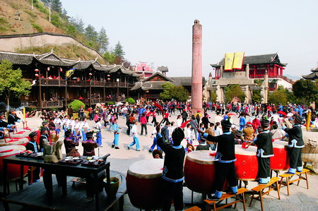 三棒鼓,唐代稱三仗鼓,明沈行符《顧曲雜言》 曰:“吳下何來有打三棒鼓乞錢者,余幼時有見之也, 起于唐咸通中(公元865年)”約于明代傳入本境, 并逐漸成為群眾增聞樂見的民間藝術形式。每年春節(jié) ,藝人們結伴走村竄寨拜年,表演對象不分貧富,戶 戶必到。如遇貧寒之家,表演者將別家贈送禮品相送 ,意在人人過節(jié)歡喜。充分體現(xiàn)出土家族人熱情好客 ,心地善良的民族性格,對加強民族團結有一定作用 。 三棒鼓通常由三至五人組成,一人擊鼓唱詞,一 人鑼鈸配樂,一人耍花棒?;ò羧L一尺,舞者 左右手各持一根,將另一根拋在空中,左右開弓,擊 打空中花棒使之不落地。也有以刀代棒,以五刀代三 棒的技藝。技藝高強者,突然把刀拋得極高,來一個 眼花繚亂,不禁稱絕。打三棒鼓,通常有“鬧春耕” 、“收割打場”、“慶豐收”、“拜年節(jié)”四套,分 “鯉魚跳龍門”、“玉女穿梭”、“板巖漂灘”等項 目。打三棒鼓技巧性強,表演時需高度集中,用力適 當,貫通一氣,并與演唱者默默配合。