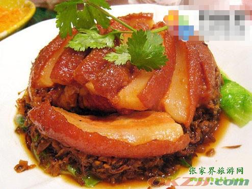 “土家扣肉“是《張家界》土家人待客的一道主菜、和豬肘子齊名。一般只有在當(dāng)?shù)氐娜宿k酒席或大型活動(dòng)的時(shí)候才會(huì)上用作主菜。土家扣肉的做法均采用五花豬肉,經(jīng)過(guò)煮、炸、蒸等多道工藝制成,上席時(shí)肉的下面一般都會(huì)用干咸菜(或者豆豉)鋪底。 |