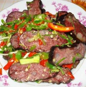 名稱: 血豆腐 介紹: 血豆腐,就是將豆腐和豬血、豬肉及花椒、辣椒等佐料拌成泥狀,捋成卵形,以竹篩置火炕上,煙熏烤成臘黃,吃起來耐嚼味香,是土家特色菜,當?shù)厝顺R云湎戮啤?在張家界的飯館里很難吃到正宗的土家特色菜,可以去做土味的特色餐館去解解饞。但是最正宗還是鄉(xiāng)下人家家里自己熏的,那才叫一個好吃?。。?/p>