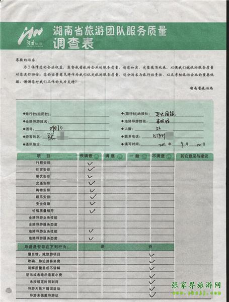 2011年9月12日張先生一行5人旅游質(zhì)量反饋