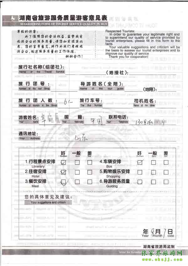 2010年8月7日山東辛先生一行6位旅游質(zhì)量反饋