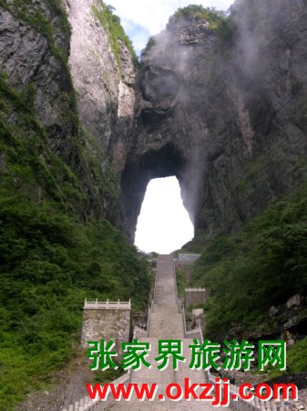 天門山古稱云夢山,又名玉屏山。坐落在張家界市區(qū)以南10公里處。公元263年,因山壁崩塌而使山體上 部洞 開一門,南北相通。三國時(shí)吳王孫休以為吉祥,賜名“天門山”。 天門洞,位于海拔1260多米的絕壁 之上,門洞高131.5米,寬37米。據(jù)地質(zhì)專家考證,門洞中央系東西巖層向 斜的交匯處,因擠壓而導(dǎo)致巖 石破碎崩塌,最終于263年形成門洞。天門山海拔1517.9米,因與山下市區(qū)相對高差達(dá)1300多米,故尤顯 偉岸挺拔,其天際線之美,堪為山的典型。